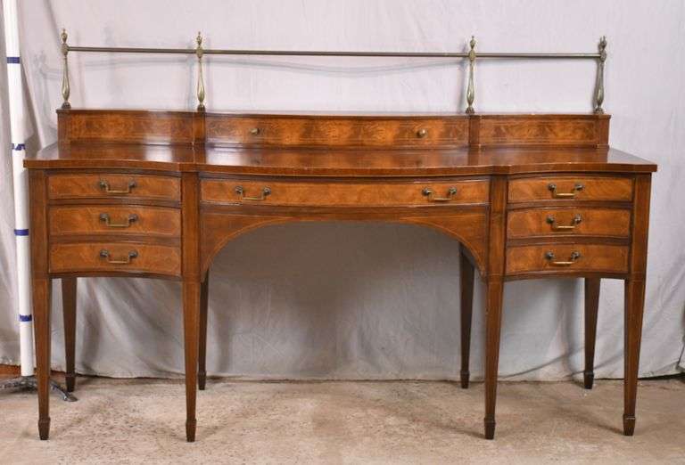 Baker large inlaid mahogany step back sideboard with brass gallery; 67-2257