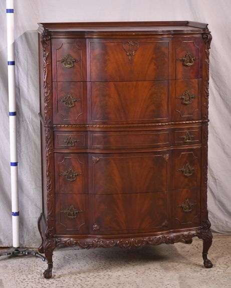 Carved crotch mahogany serpentine front chest on chest; 68-3056A