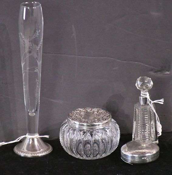 Duchin Creation etched glass bud vase with sterling silver base, crystal dresser jar with sterling silver cap, crystal perfume bottle with sterling cuff, and sterling silver pill case; 869-328