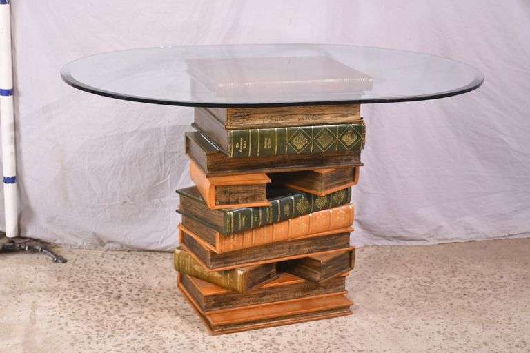 Beveled glass top accent table with "stacked leatherbound book"-look base; 68-7272