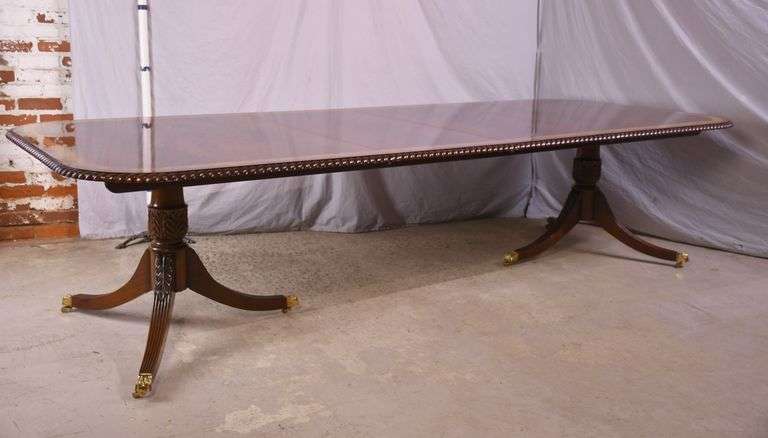 Inlaid crotch mahogany double pedestal dining table with 2 leaves; 68-7151B