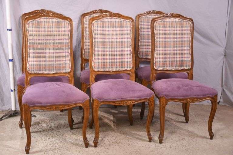 LOT 61 - Set of 6 carved French style dining chairs with purple seats and plaid backs; 68-7339B