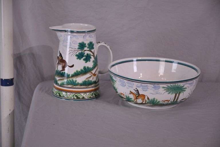 Porcelain hunt scene pitcher and bowl; 396-1431