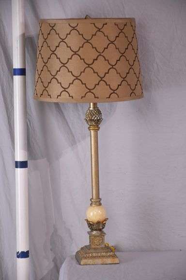 LOT 365 - Ornate gold stick lamp with shade; 11238-098