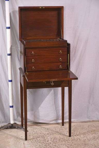 inlaid mahogany lift top drop front silver chest with fitted interior; 191-611