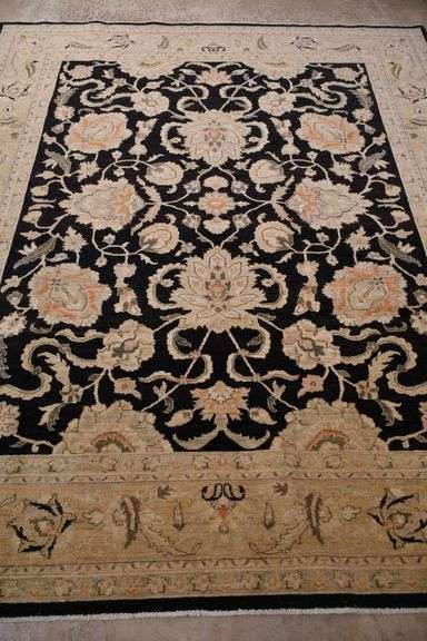 LOT 139 - 8.3'x9.10' hand knotted Peshawar rug with black field; 40-105982