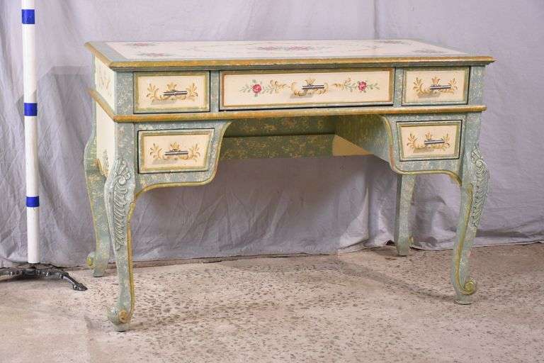 LOT 73 - Decorated kneehole desk with drop-front keyboard drawer; 55-12448