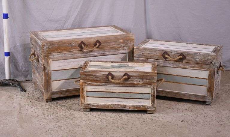 Group of 3 distressed painted lift-top trunks in graduating sizes; 55-12484