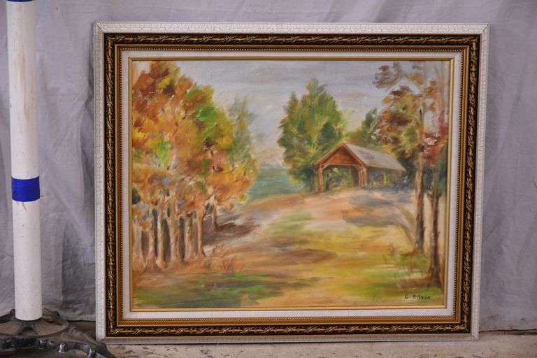 Framed painting on canvas board of a landscape and bridge scene by E. Gibson; 9485-122