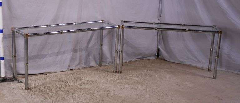 LOT 133 - Pair of cane cut chrome console tables with glass tops; 55-12474