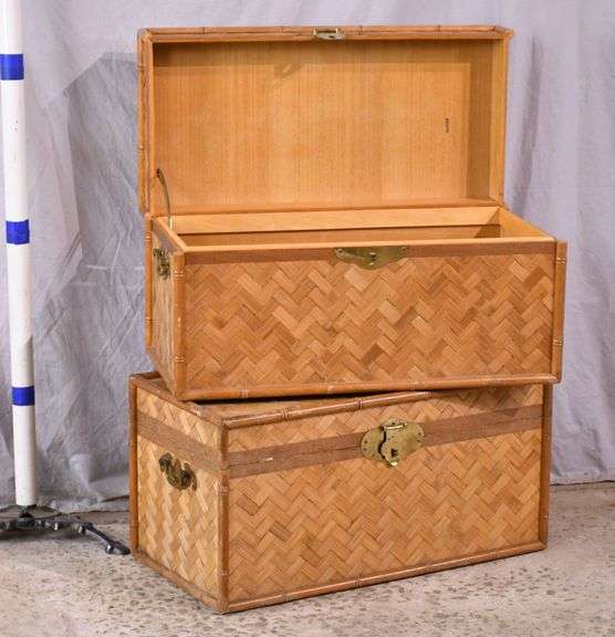 LOT 432 - Pair of woven lift-top boxes with cane-cut trim; 55-12485