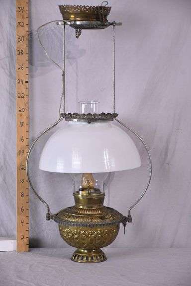 LOT 140 - Vintage ornate brass electric converted oil hanging light fixture; 18654-012