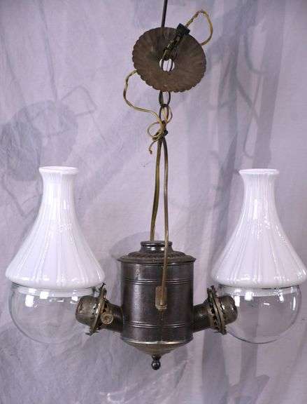 vintage electric converted oil lamp with milk glass shades; 18654-006