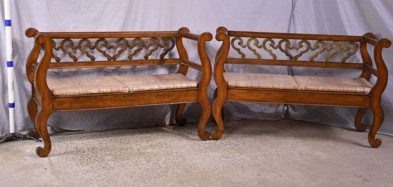 Pair of benches with rush seats and gold metal backs; 18655-002