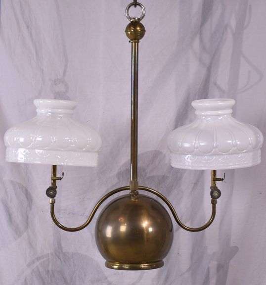 Vintage brass 2 light hanging oil lamp with milk glass shades; 18654-013