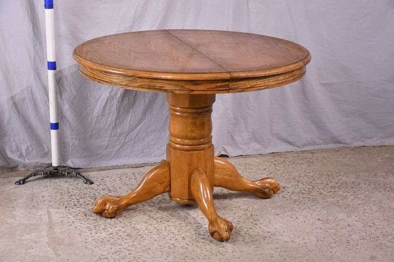 Round oak single pedestal dining table with ball in claw feet; 1116-818
