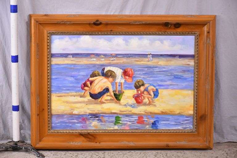 LOT 257 - Framed painting on canvas of children playing on a beach; 9463-004