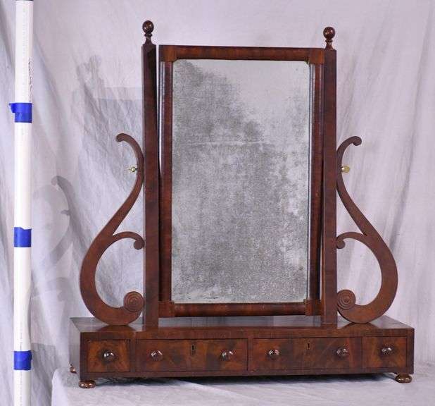 Early crotch mahogany shaving mirror with 4 drawers; 10508-007