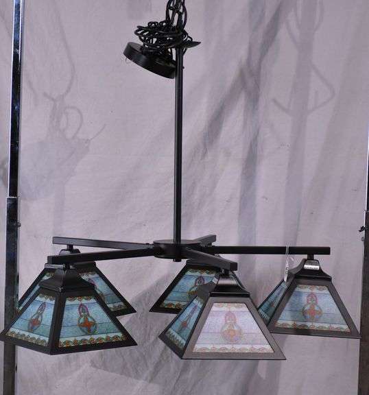 LOT 291 - Black 5 light chandelier with blue/green plastic shades; 1116-820