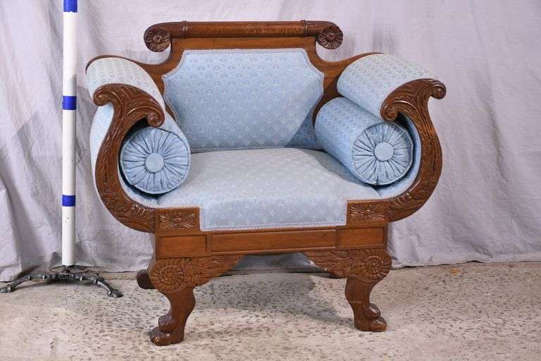LOT 329 - Carved mahogany Empire style armchair with blue fabric; 18656-011