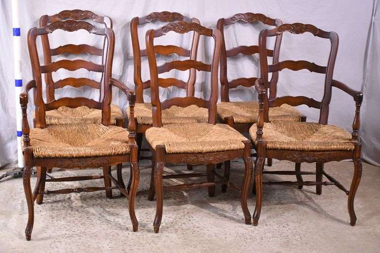 Set of 6 carved country French style ladder back dining chairs with rush seats; 1152-169
