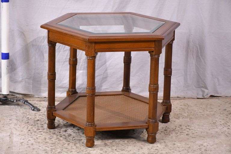 Hexagonal 2 tier side table with beveled glass top; 1152-168