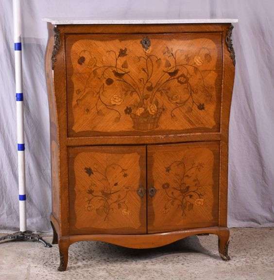 Inlaid walnut bombe style Abattant with marble top; 37-2793