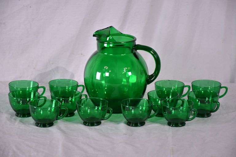 LOT 373 - Green glass pitcher with 12 cups; 697-1621