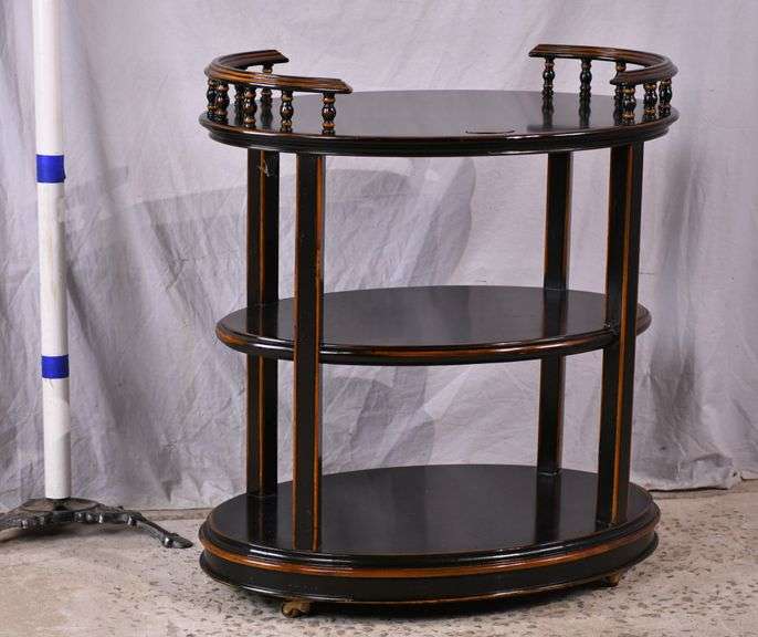 LOT 488 - Theodore Alexander "Ateliers de la Madeleine" distressed black oval three-tier serving cart; 824-124