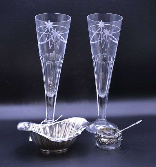 Pair of etched crystal toasting flutes with sterling silver nut bowl, salt cellar, and spoon; 869-672