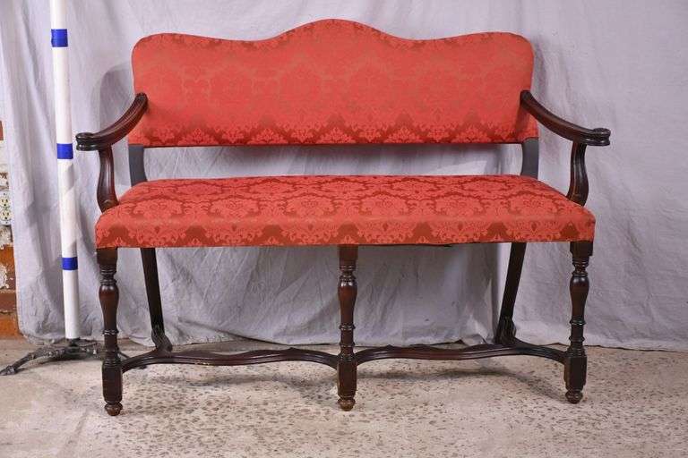 LOT 531 - Open arm settee with red upholstered seat and back; 200-315