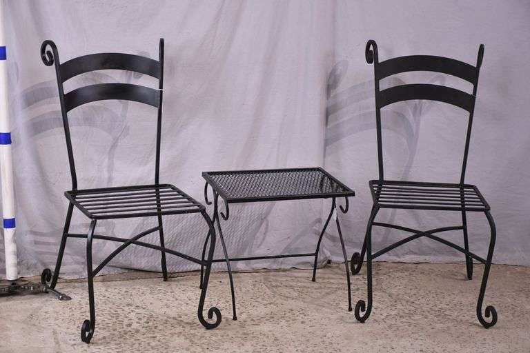 LOT 541 - Pair of black iron chairs and a side table; 869-678